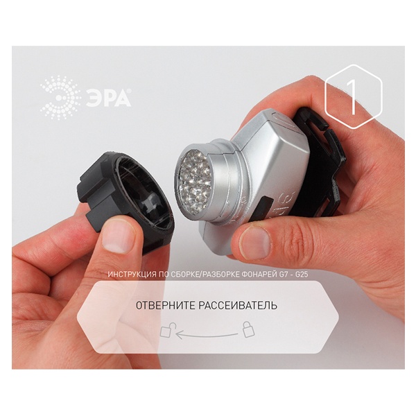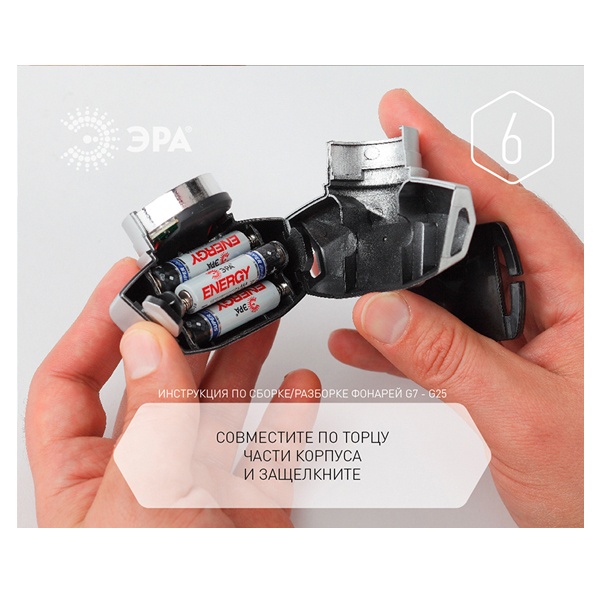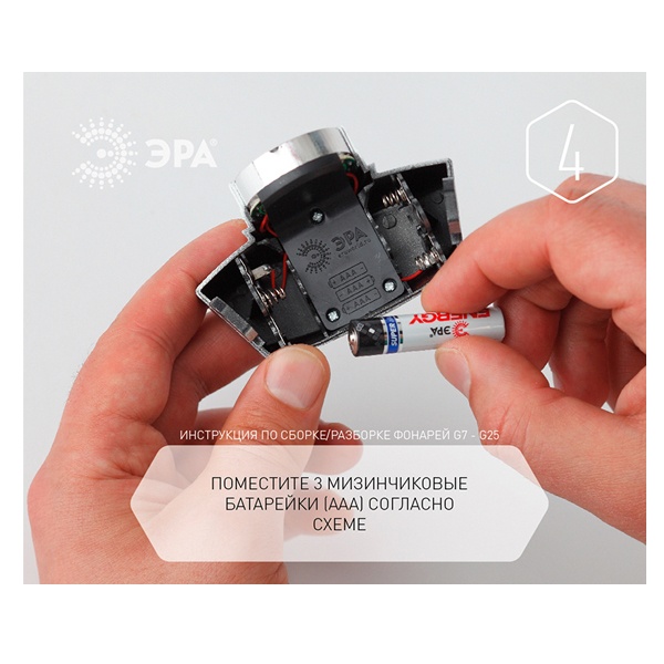 Добрый день, Елена.1) У фонаря снимается кольцо (которое обрамляет источник света);2) Возьмите за торцы и надавите на кнопки так, чтобы разомкнуть половины корпуса;3) Поменяв батарейки 3xААА согласно схеме, совместите по торцам части корпуса и защелкните его.4) Установите кольцо обратно.