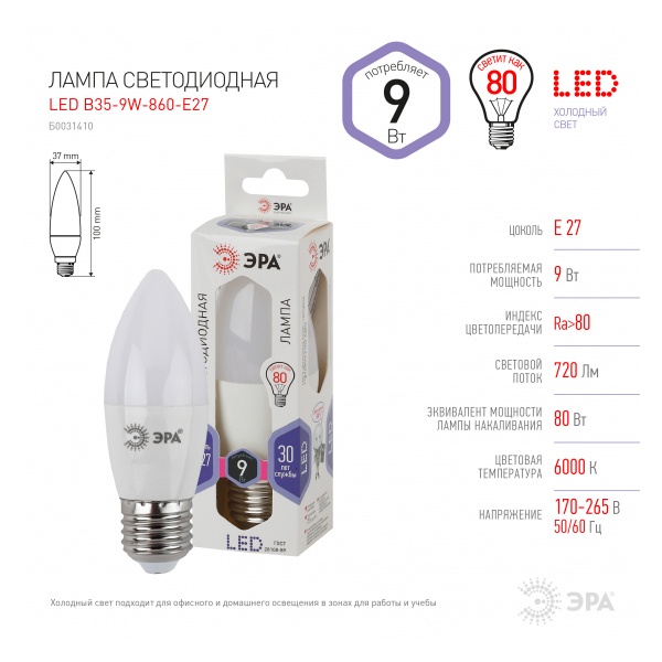 Б0031410 Лампа светодиодная свеча ЭРА LED B35 9W 860 6000K 220V E27 дневной свет фото 1