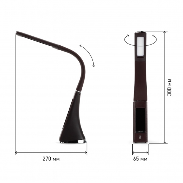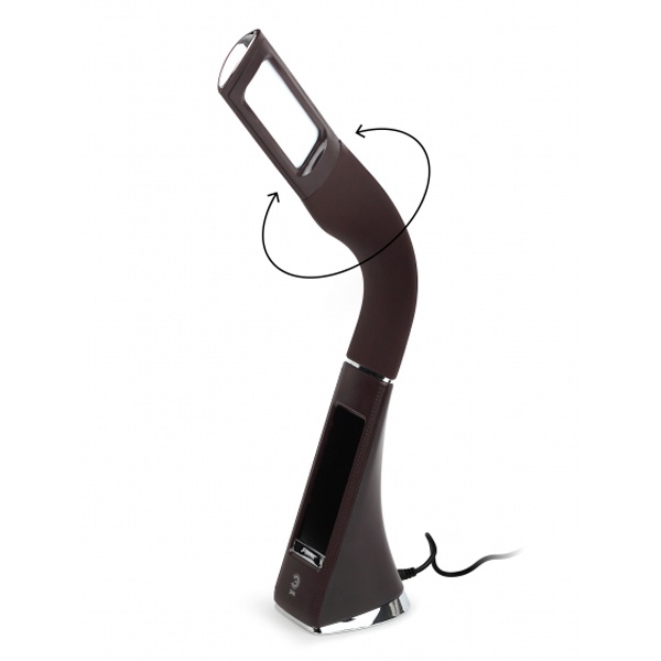 Настольный светильник (коричневый) со светодиодами (LED) в качестве источников света мощностью 7Вт. Цветовая температура 4000К. Сенсорное переключение, 3 уровня яркости. Многофункциональный дисплей: часы, будильник, дата, день недели, термометр.