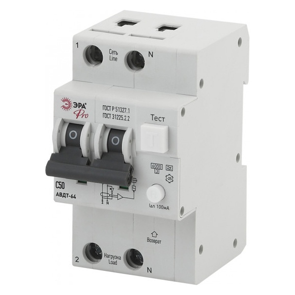 Двухполюсный автоматический выключатель дифференциального тока, ток нагрузки 50А, ток утечки 100 мА типа А, характеристика расцепителя С, 6кА, Эра АВДТ-64 Б0031856