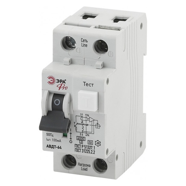 Двухполюсный автоматический выключатель дифференциального тока, ток нагрузки 40А, ток утечки 100 мА типа А, характеристика расцепителя С, 6кА, Эра АВДТ-64 Б0031862