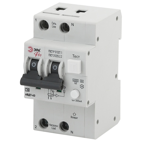 • Дифавтомат ЭРА 1П+Н С50А 300мА тип A однофазный электронный 6кА АВДТ-63 (NO-902-15) (дифференциальный автомат, АВДТ)