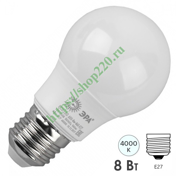Светодиодная лампочка формы груша ЭРА, мощностью 8 Ватт, с цоколем E27, нейтральный белый свет Б0032096