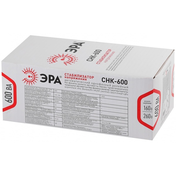 • Стабилизатор напряжения ЭРА СНК-600 160-260В, 600ВА, 2 розетки, цифровой дисплей