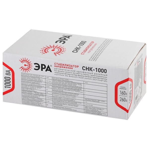 Стабилизатор напряжения ЭРА серии СНК предназначен для поддержания стабильного однофазного напряжения питания нагрузок бытового назначения в пределах 220В±10%, при отклонениях сетевого напряжения по значению и длительности в пределах от 160 до 260В.