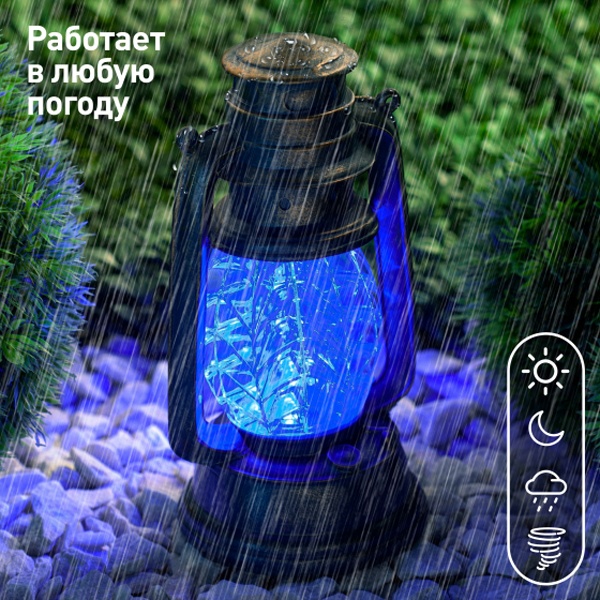 Переносной декоративный светильник фабрики ERA серии SL имеет оригинальный дизайн в стиле ретро и представляет собой причудливую лампу с синим плафоном. Он пригодится для украшения и освещения ландшафтных композиций. Садовый светильник работает от аккумулятора, который заряжается от солнечной батареи. Заряда аккумулятора хватает на 8 часов непрерывной работы. Благодаря этому не нужны провода и розетки, его можно брать с собой куда угодно и там использовать. Корпус светильника выполнен из материала полистоун. В качестве осветительного элемента используется светодиодная лампа. Габаритные размеры фонаря следующие: высота – 21,3 см, ширина – 13,0 см, длина – 15,0 см. Светильник рассчитан на применение на улице, он работает в любую погоду. Степень защиты устройства – IP44, диапазон рабочих температур от – 45 до + 45 градусов Цельсия. Светильник имеет длительный срок службы, он обладает влагозащищенным корпусом и рассчитан для применения на улице. Светильник заряжается в течение всего светового дня. Максимальная мощность лампы – 2 Ватта, Площадь освещения – 5 кв м. Световой поток – 4 Люмен. Вес изделия – 0,58 кг Гарантийный срок – 6 месяцев. Срок службы изделия – 2 года.