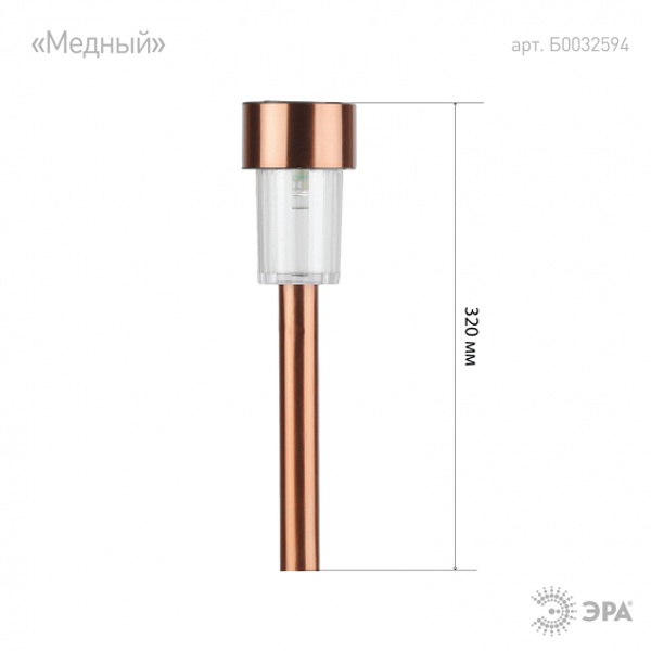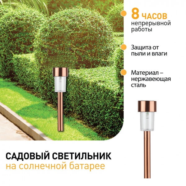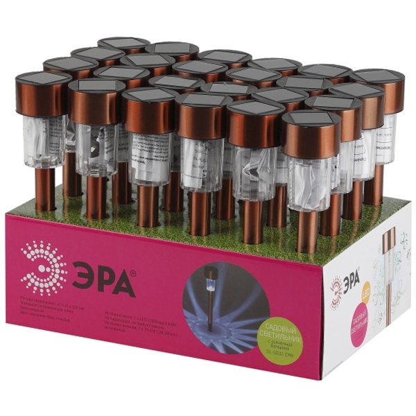 Беспроводной грунтовый садовый светильник классической формы на солнечной батарее бренда Era имеет стальной корпус и оригинальное «медное» покрытие. В темное время суток он начинает светиться ярким белым светом и идеально впишется в любой ландшафтный дизайн. Садово-парковый светильник работает на солнечной батарее и от аккумулятора, его заряда хватает на 8 часов непрерывной работы. Благодаря встроенному фотоэлементу, устройство автоматически заряжается под солнечным светом в дневное время. Индикатор автоматически включает освещение в темное время суток и выключает днем. Источником света служат LED лампа. Высота фонаря – 32см. Материал основания устройства – сталь, материал цилиндрического плафона – пластик. Светильник рассчитан на применение на улице. Степень защиты изделия – IP44, диапазон рабочих температур от -40 до +40 градусов Цельсия. Гарантийный срок – 6 месяцев. Срок службы – 2 года.