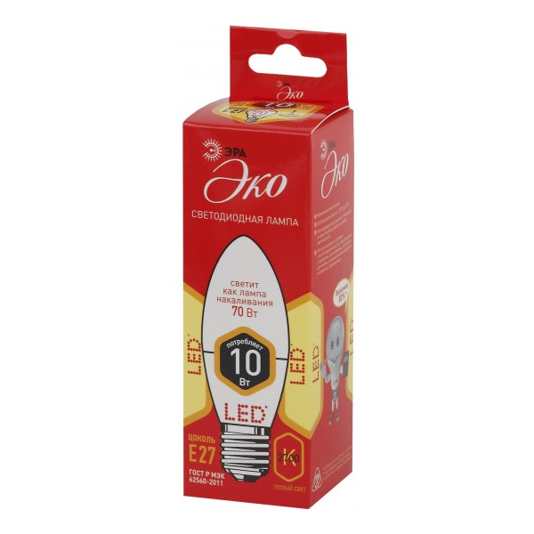 Бытовая светодиодная лампа ЭРА Серии Бюджет, создаёт яркое ровное освещение и экономит до 90% электроэнергии по сравнению с лампой накаливания с аналогичным световым потоком. Светит теплым светом с жёлтым оттенком - такая цветовая температура эффективна для отдыха и уютной атмосферы в доме. Используется в потолочных, настенных, настольных светильниках, в люстрах и бра. Мгновенно включается и не нагревается.