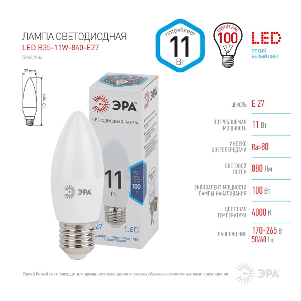 Лампа светодиодная B35-11w-840-E27 свеча 880лм ЭРА Б0032983