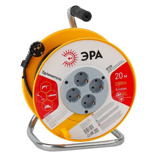 Удлинитель силовой на пластиковой катушке, c заземлением, четыре гнезда, длина провода 20 метров Б0033020