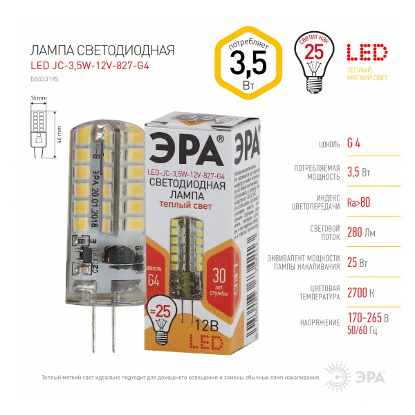 Б0033195 Лампа светодиодная ЭРА LED JC-3,5W-12V-827-G4 теплый свет 734213