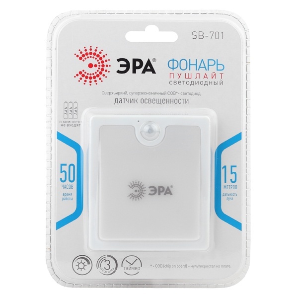 Фонарь имеет функцию автоматического включения и выключения при наличии / отсутствии движения в помещении. Он работает в нескольких режимах. Первый - стандартное свечение без перерывов. В данном режиме доступно диммирование - при нажатии и удерживании кнопки включения можно выбирать нужный уровень яркости. Следующий режим - работа фонаря при активных датчиках движения и освещённости. Автоматически будет включаться свет именно того уровня яркости, какой был выбран при первом режиме. Датчики работают в паре: при наличии движения в помещении фонарь включается только в темноте. Это позволяет избежать ненужной подсветки при включенном основном свете. Выключается пушлайт через 25 секунд после выхода человека из комнаты или коридора. Одного комплекта алкалиновых элементов питания хватает на 50 часов непрерывного освещения.