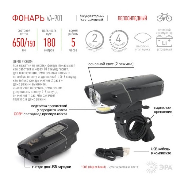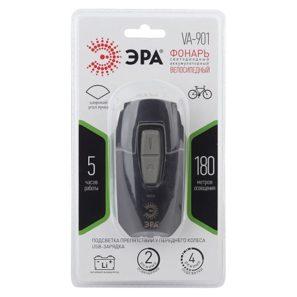 ЭРА VA-901 - светодиодный велосипедный фонарь на литиевом аккумуляторе. Не требует батареек и удобно заряжается от USB. От одной подзарядки работает свыше 5 активных часов благодаря мкому литиевому аккумулятору. Два режима освещения и 4 режима подсветки. Высокая дальность освещения и широкий угол светового пучка.В комплекте с прочным велосипедным фонарм поставляется наджное крепление и провод micro USB для подзарядки. Провод универсальный - подходит для заряда любых мобильных гаджетов с аналогичным разъёмом. С таким помощником можно кататься всю летнюю ночь напролёт - литиевый аккумулятор отлично держит заряд. Предусмотрены целых 6 режимов освещения для разных ситуаций. В пути отлично подойдёт направленный луч с высокой дальностью - почти 200 метров. Этот же режим хорошо подсвечивает препятствия у переднего колеса во время движения. Режимы можно комбинировать. А также менять яркость в зависимости от ситуации - от максимально яркого света до эконом-режима. В нештатной ситуации оперативно включается аварийный режим мигания.