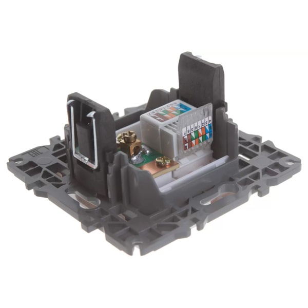 Телевизионная оконечная розетка совместно с сетевым разъемом RJ45, выполнена из негорючего пластика без содержания галогенов. Данная комбинация позволяет экономить место и идеально подходит для SMART TV. Гнездо с разъемом RJ45 закрывается крышкой. Установка производится скрыто в подрозетники на винтах либо в распор на лапки. Суппорт с пазами для выравнивания по горизонтали и вертикали при создание рабочего места из нескольких электроустановочных изделий.