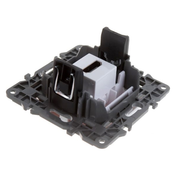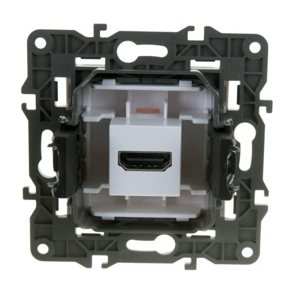Мультимедийная розетка с разъемом HDMI для подключения мониторов, проекторов и другого оборудования, с пластиковой лицевой панелью из негорючего материала. Монтаж производится скрыто в подрозетники на винтах либо в распор на лапки. Суппорт с пазами для выравнивания по горизонтали и вертикали при создание рабочего места из нескольких электроустановочных изделий.
