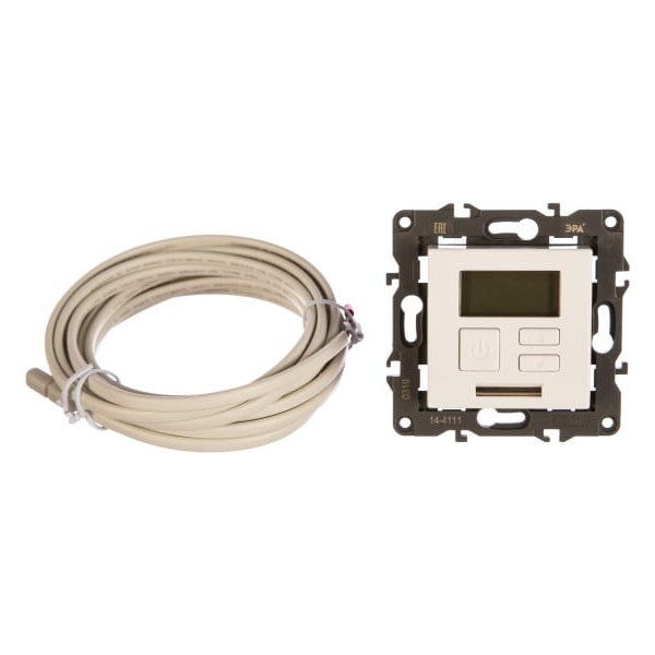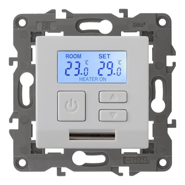 Терморегулятор теплый пол / отопление электронный серии Эра Elegance цвет белый 14-4111-01. Рамки приобретаются отдельно. Рамки Эра Elegance ПЛАСТИК: 1 пост 14-5001-хх, 2 поста 14-5002-хх, 3 поста 14-5003-хх, 4 поста 14-5004-хх, 5 постов 14-5005-хх; СТЕКЛО: 1 пост 14-5101-хх, 2 поста 14-5102-хх, 3 поста 14-5103-хх, 4 поста 14-5104-хх; МЕТАЛЛ: 1 пост 14-5201-хх, 2 поста 14-5202-хх, 3 поста 14-5203-хх, 4 поста 14-5204-хх; ДЕРЕВО: 1 пост 14-5301-хх, 2 поста 14-5302-хх, 3 поста 14-5303-хх, 4 поста 14-5304-хх (хх - код цвета: 00-прозрачный, 01-белый, белёный дуб, 02-слоновая кость, 03-алюминий, 04-шампань, 05-чёрный, чёрное дерево, 07-ясень, 09-дуб, 10-венге, 11-клён, 14-медь, 21-жёлтый, 22-оранжевый, 23-красный, 25-бордо, 26-лайм, 27-зелёный, 28-голубой, 29-синий, 30-розовый, 31-мокко, 32-серый, 41-сталь, 42-титан).