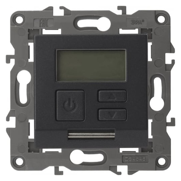 Терморегулятор теплый пол / отопление электронный серии Эра Elegance цвет антрацит 14-4111-05. Рамки приобретаются отдельно. Рамки Эра Elegance ПЛАСТИК: 1 пост 14-5001-хх, 2 поста 14-5002-хх, 3 поста 14-5003-хх, 4 поста 14-5004-хх, 5 постов 14-5005-хх; СТЕКЛО: 1 пост 14-5101-хх, 2 поста 14-5102-хх, 3 поста 14-5103-хх, 4 поста 14-5104-хх; МЕТАЛЛ: 1 пост 14-5201-хх, 2 поста 14-5202-хх, 3 поста 14-5203-хх, 4 поста 14-5204-хх; ДЕРЕВО: 1 пост 14-5301-хх, 2 поста 14-5302-хх, 3 поста 14-5303-хх, 4 поста 14-5304-хх (хх - код цвета: 00-прозрачный, 01-белый, белёный дуб, 02-слоновая кость, 03-алюминий, 04-шампань, 05-чёрный, чёрное дерево, 07-ясень, 09-дуб, 10-венге, 11-клён, 14-медь, 21-жёлтый, 22-оранжевый, 23-красный, 25-бордо, 26-лайм, 27-зелёный, 28-голубой, 29-синий, 30-розовый, 31-мокко, 32-серый, 41-сталь, 42-титан).