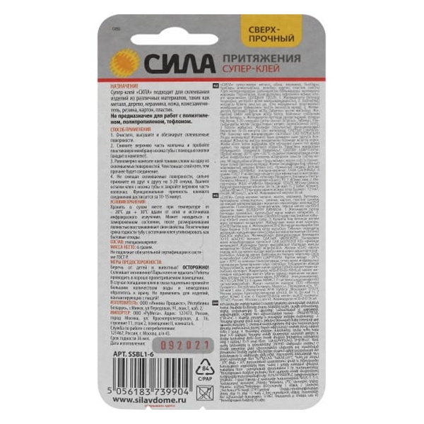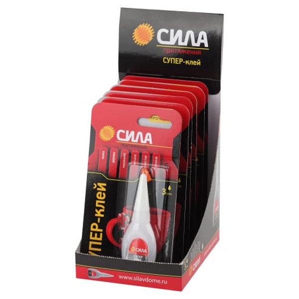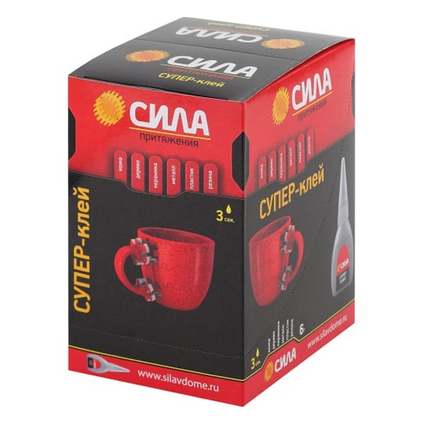 Супер-клей СИЛА, идеально подходит для быстрого и эффективного ремонта различных предметов мебели, интерьера и т.д. Накрепко схватывает дерево, резину, стекло, фарфор и пластик, при этом супер клеи экономично расходуются и высыхают за несколько секунд.