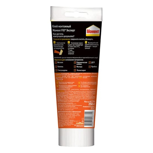 Момент FIX Эксперт не содержит органических растворителей. Идеально подходит для склеивания различных строительных и отделочных материалов. Не подходит для полиэтилена, полипропилена и тефлона.