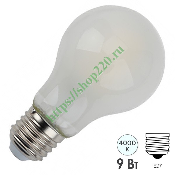 Лампочка с нитевидными светодиодами формы груша ERA, мощностью 9 Ватт, с цоколем E27, нейтральный белый свет, матовая колба Б0035034