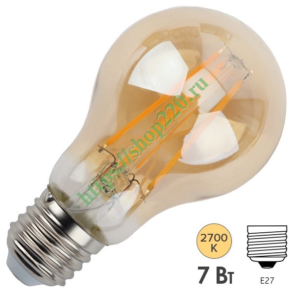 Филаментная лампа с золотистой колбой. Выгодно смотрятся в соверменных интерьерах, напоминают старую добрую лампу накаливания, но сроком службы до 30000 часов, гарантией 2 года и значительной экономией электроэнергии.