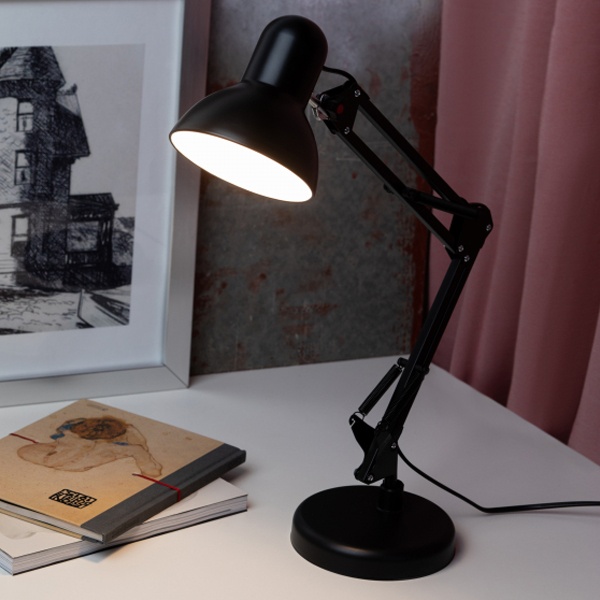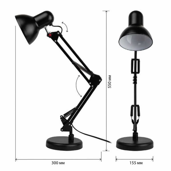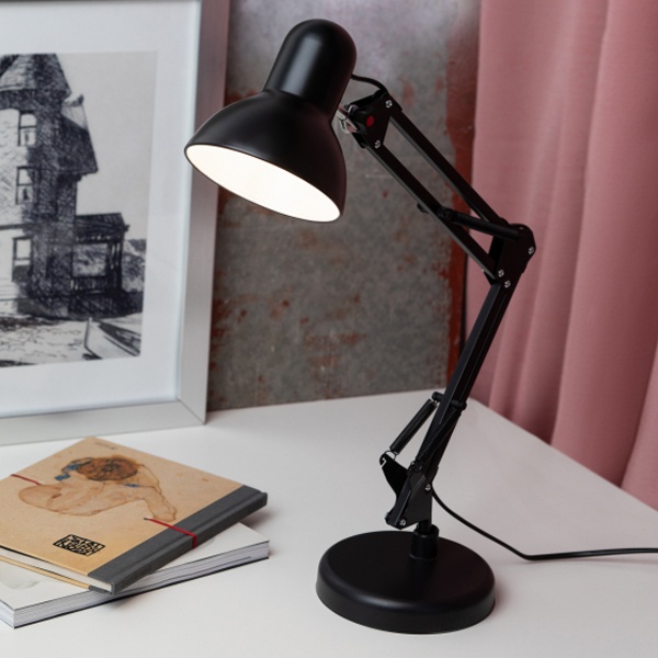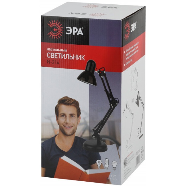Настольный светильник ЭРА N-214-E27 классического дизайна может использоваться с разными источниками света - лампой накаливания, компактной люминесцентной лампой (КЛЛ) или светодиодной (LED) лампой. Выключатель на проводе. Устойчивое основание. Высота плафона регулируется двухсекционной сгибающейся стойкой, направление света - поворотом и наклоном плафона в любом направлении.