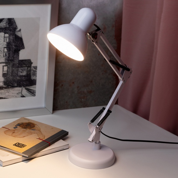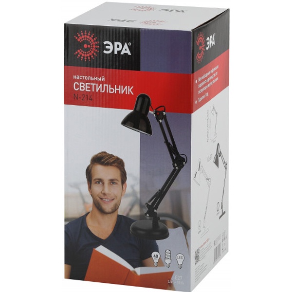 Настольный светильник ЭРА N-214-E27 классического дизайна может использоваться с разными источниками света - лампой накаливания, компактной люминесцентной лампой (КЛЛ) или светодиодной (LED) лампой. Выключатель на проводе. Устойчивое основание. Высота плафона регулируется двухсекционной сгибающейся стойкой, направление света - поворотом и наклоном плафона в любом направлении.