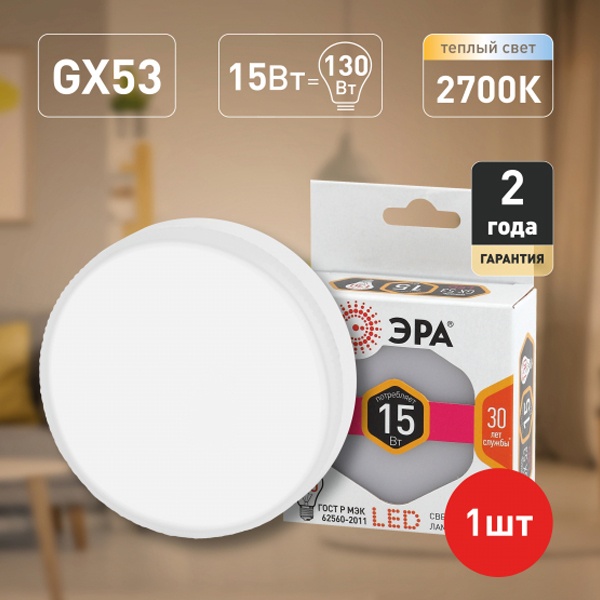 • Лампа светодиодная таблетка ЭРА LED GX 15W 827 2700K 220V GX53 теплый свет