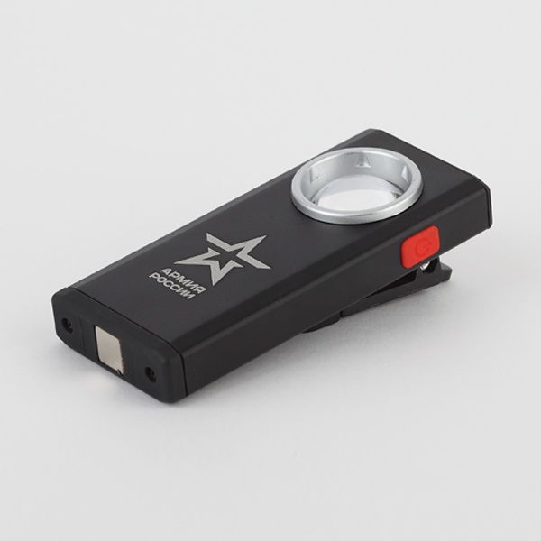 Светоотражатель с линзой для широкого угла освещения. Кнопка включения яркого красного цвета расположена в боковой части корпуса, покрыта мягким прорезиненным материалом. Типы крепления: прищепка (для нагрудного кармана, ремня сумки) с внутренними резиновыми вставками (надёжно фиксируют устройство даже на гладкой скользкой поверхности) и встроенным крючком (для подвешивания); магнит (для закрепления на металлических поверхностях). Зарядка от USB, кабель в комплекте. Одного полного заряда хватает на 2 часа непрерывного свечения. Есть возможность выбора яркости света (диммирование). Дальность светового луча - 85 метров.