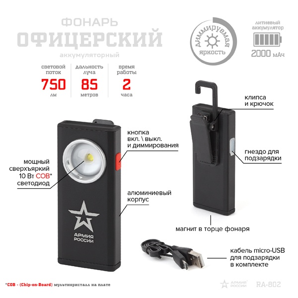Усовершенствованная модель традиционного офицерского фонаря. Ёмкий литиевый аккумулятор 2000 мАч. При своих компактных размерах даёт очень яркий свет мощностью 10 Вт. Корпус изготовлен из алюминия, имеются защитные резиновые вставки в нижней и верхней частях.