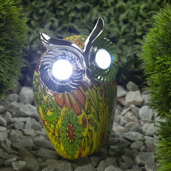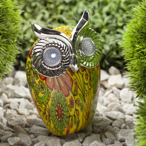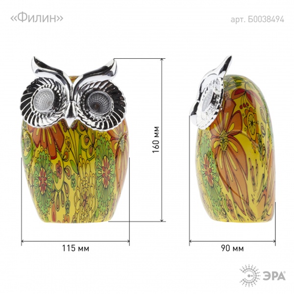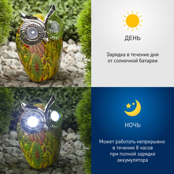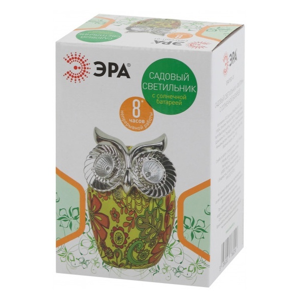 Цветной наземный садовый светильник на солнечной батарее бренда ERA выполнен в виде фигурки филина высотой 16 см. В дневное время суток он является прекрасным украшением сада, а в темное время суток служит декоративной подсветкой ландшафта. Садово-парковый светильник работает на солнечной батарее, от аккумулятора, его мощность составляет 2 Ватта. Благодаря встроенному фотоэлементу, устройство автоматически заряжается под солнечным светом в дневное время. Источником света служат 2 LED лампы, которые поставляются в комплекте. Материал корпуса декоративного светильника – полистоун, имитирующий керамику. Прочная конструкция и влагонепроницаемый корпус обеспечивают светильнику длительный срок службы. Степень защиты изделия – IP44, диапазон рабочих температур от – 60 до + 40 градусов Цельсия. Светильник рассчитан для применения на улице. Вес изделия – 0,285 кг. Гарантийный срок – 6 месяцев. Срок службы – 2 года.