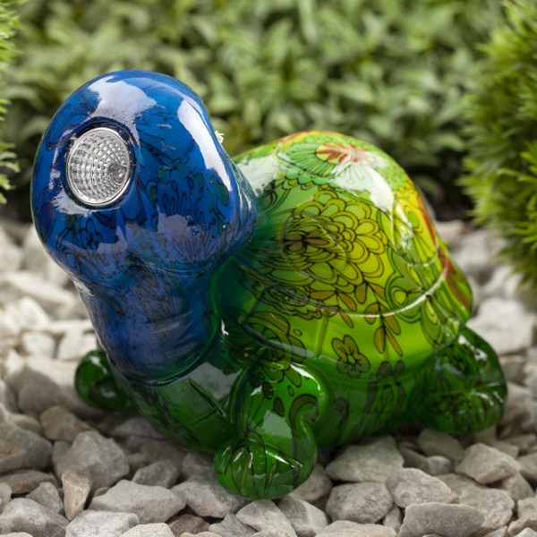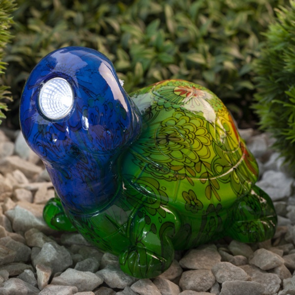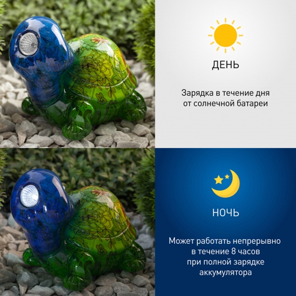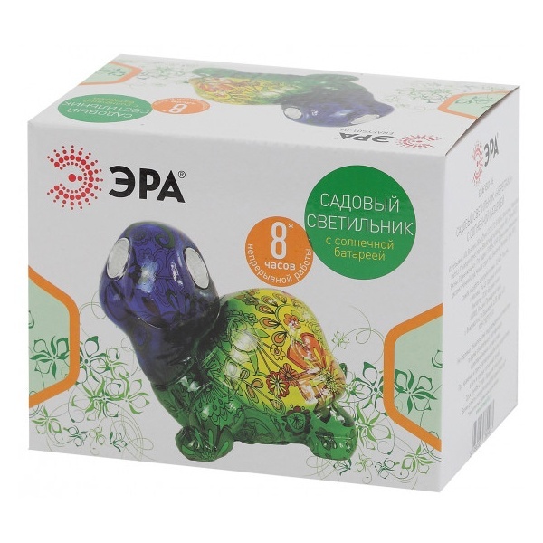 Современный садово-парковый светильник на солнечной батарее "Черепаха" производителя ERA станет эффектным обитателем дачного участка. Небольшие размеры позволят разместить его в палисаднике, украсить пруд, веранду, кустарник, изящно подсветить аллею или вход в дом. После захода солнца маленькая черепашка загорается. Глаза заливаются белым светом и освещают территорию вокруг, создавая сказочную обстановку на участке. Яркий рисунок на корпусе сеет радость и веселье. Фигура из искусственного камня высотой 13 см с легкостью устанавливается на землю. LED светильник функционирует на солнечной батарее. Питание происходит во включенном режиме днем. Благодаря встроенному фотоэлементу, освещение автоматически включается в темное время суток и выключается днем. Максимальная мощность ламп – 2 Ватта, площадь освещения – 5 кв м, световой поток – 4 Люмен. Работа от солнечной батареи предусматривает 8 часов непрерывной работы. Высокая степень защиты от пыли и влаги IP44 позволяет оставлять светильник на улице даже во время дождя. Гарантийный срок – 6 месяцев. Срок службы изделия – 2 года.