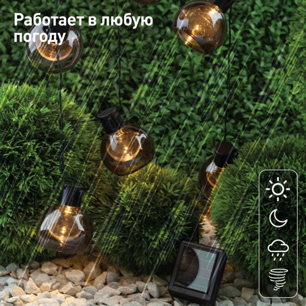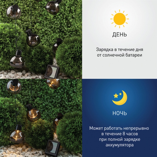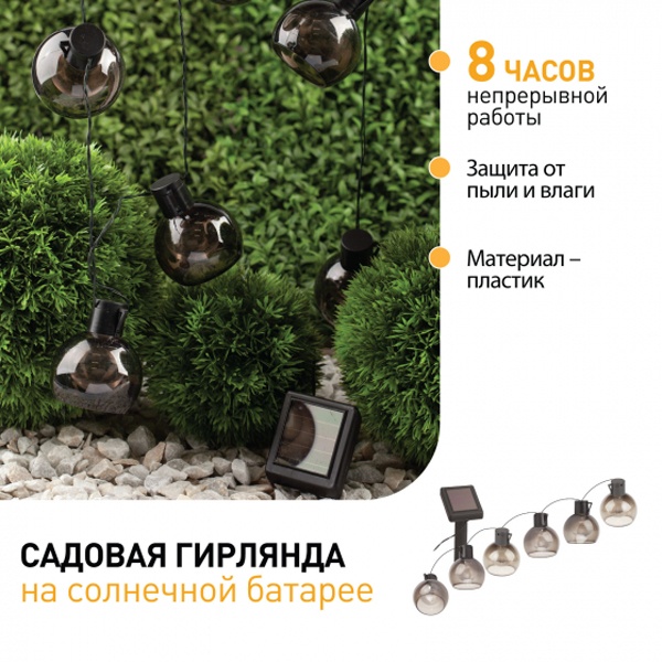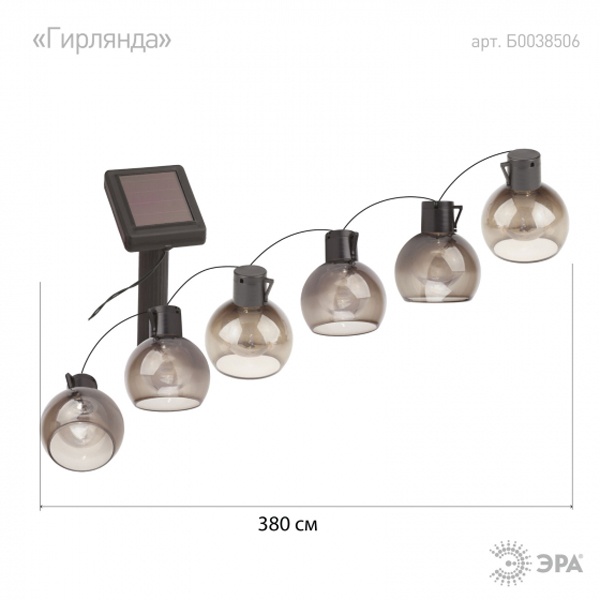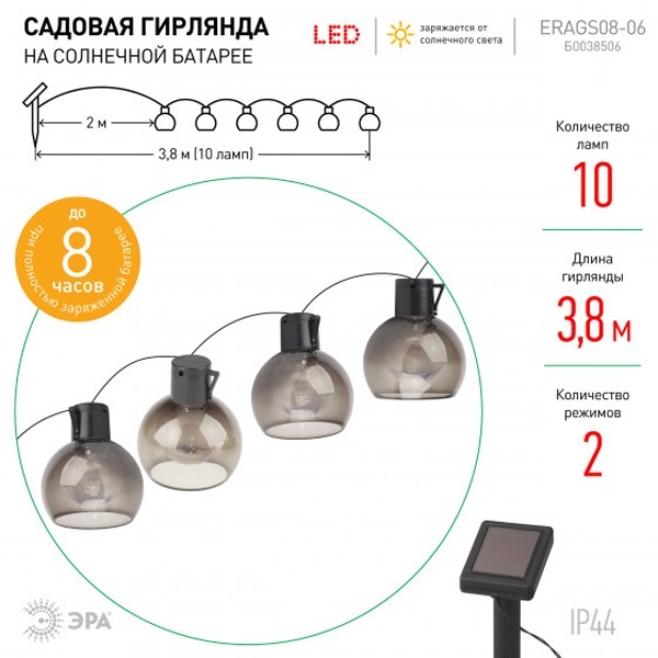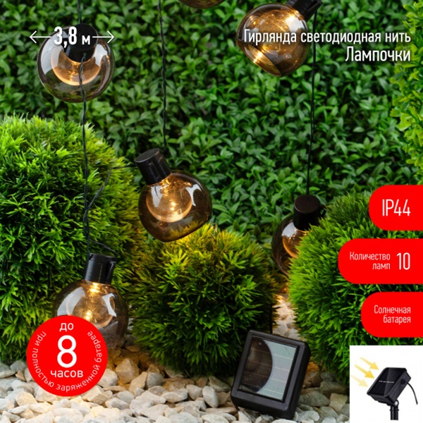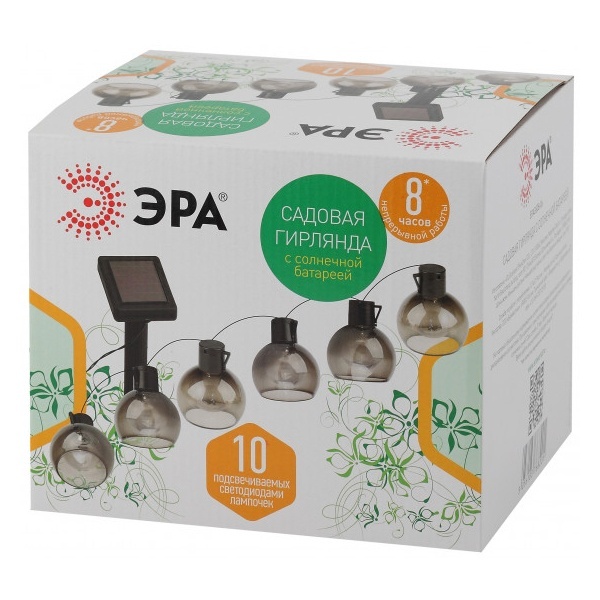 ERAGS08-06 ЭРА Садовая гирлянда 10 подсвечиваемых светодиодами лампочек.Общая длина от солнечной па