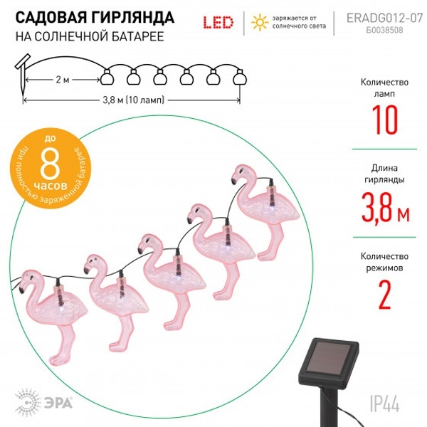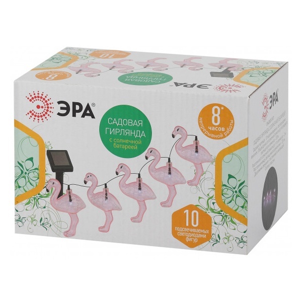 ERADG012-07 ЭРА Садовая гирлянда 10 подсвечиваемых светодиодами фламинго.Общая длина от солнечной п