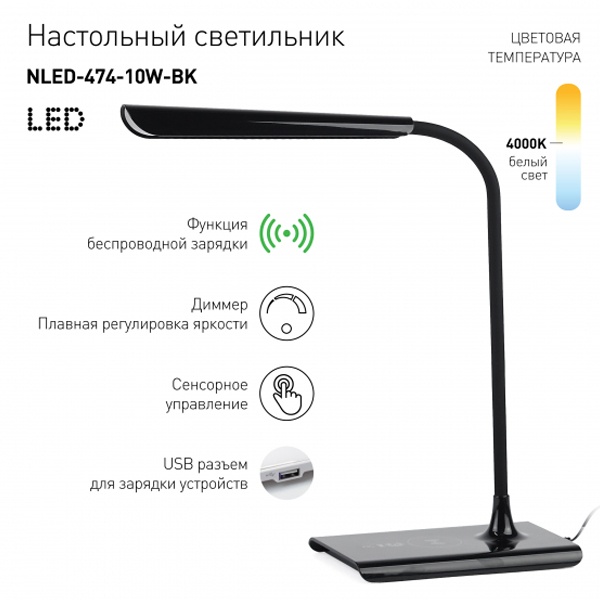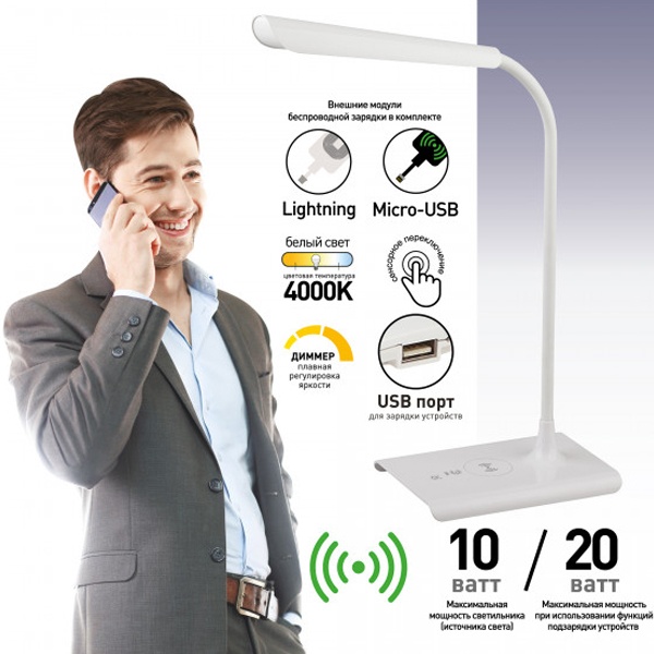 Светильник со светодиодами (LED) в качестве источников света. Высота плафона регулируется гибкой стойкой, направление света регулируется поворотом плафона в любом направлении. Цветовая температура 4000К. Сенсорное переключение. Плавный диммер для регулировки яркости. Функция беспроводной зарядки. В комплекте внешние модули беспроводной зарядки: Lightning (для iPhone 5 и выше) и Micro-USB (для Android). USB разъем для зарядки устройств.
