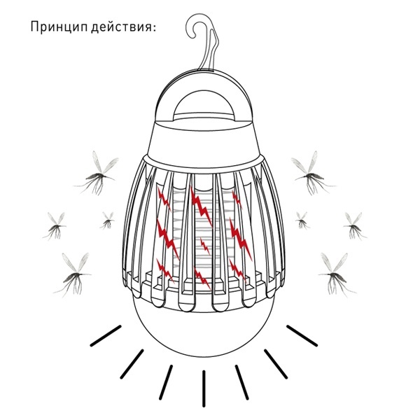 Оснащена двумя типами светодиодов - ультрафиолетовыми и стандартными белыми. Первые не оказывают воздействия на насекомых и выполняют функцию уличной подсветки (яркость светового потока 100 Лм). Вторые привлекают своим светом летающих насекомых. Комары и мошки подлетают к решётке лампы, соприкасаются с ней - и получают удар током.