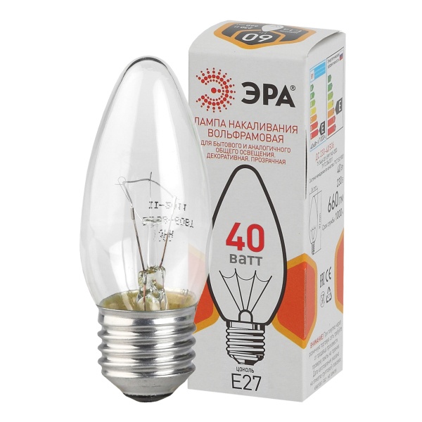 Лампа накаливания ДС 40-230-E27-CL ДС (B36) 40Вт свеча E27 230В ЭРА Б0039128