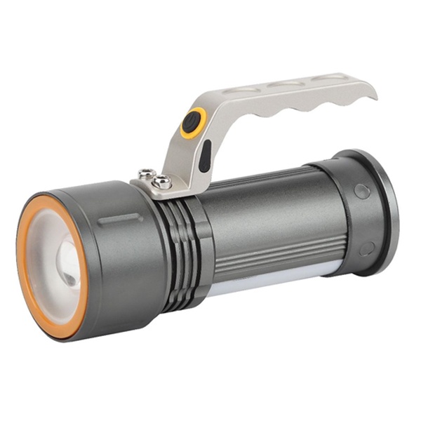 Сверхъяркий аккумуляторный фонарь-светильник с регулируемым фокусом и высокой дальностью светового луча (180 м). Стильный актуальный дизайн с яркими деталями - жёлтая окантовка кнопки и оранжевая окантовка отражателя. Кнопка включения покрыта прорезиненным материалом - приятные тактильные ощущения. Для экономии заряда можно использовать режим 50% яркости, для привлечения внимания в темноте - режим мигания. Включив боковой светильник с широким заливающим освещением, удобно создавать уютную атмосферу на привале, а основной свет (сверхъяркий светодиод 5 Вт) - использовать в пути. Эргономичная ручка с углублениями для пальцев - дополнительный комфорт при освещении дороги.