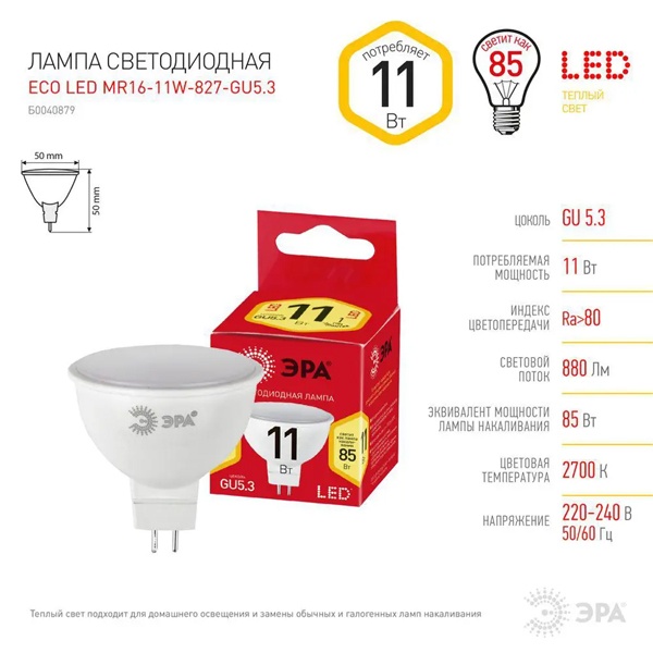 Характеристики:- Мощность: 11 Вт (Аналог лампы накаливания 85 Вт)
