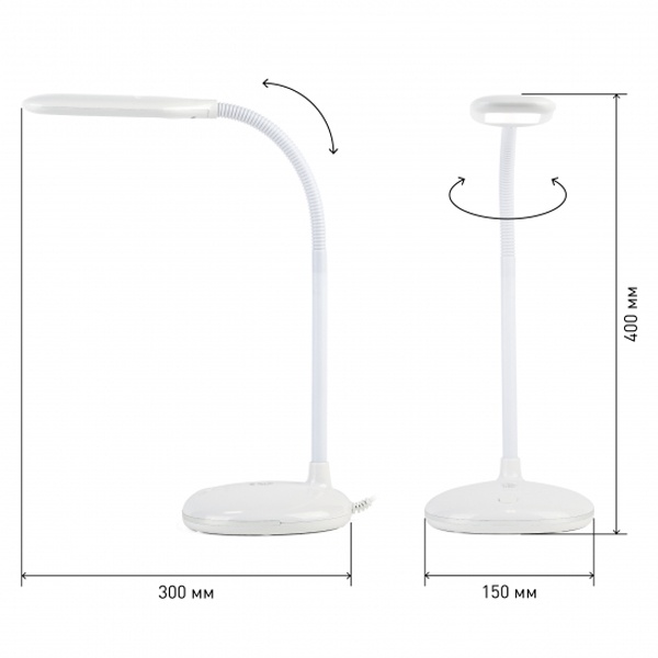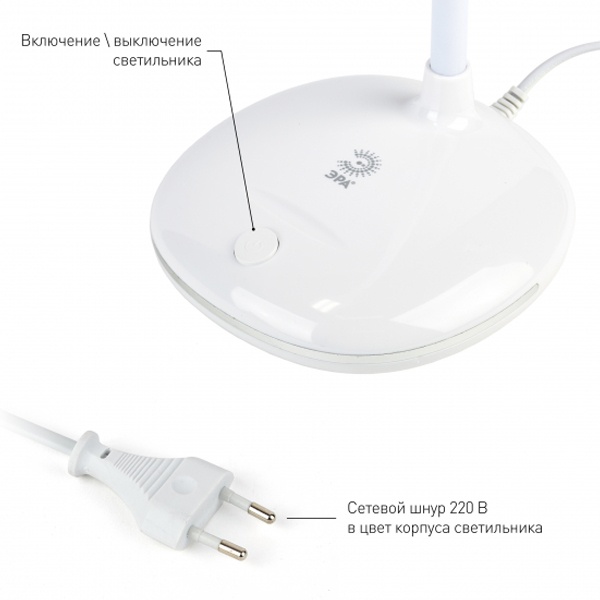 ЭРА NLED-477 - светодиодный светильник с ярким белым светом и гибкой стойкой. Мощность - 8W. Выключатель удобно расположен на основании. Цветовая температура - 4000К, это базовый белый свет, приближенный к естественному дневному.Высота плафона регулируется гибкой стойкой, направление света регулируется поворотом плафона в любом направлении.