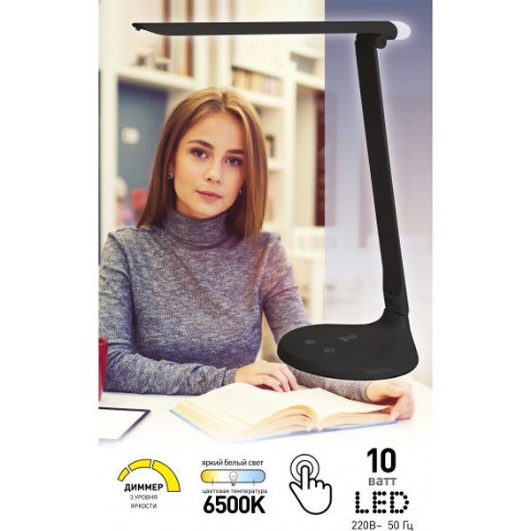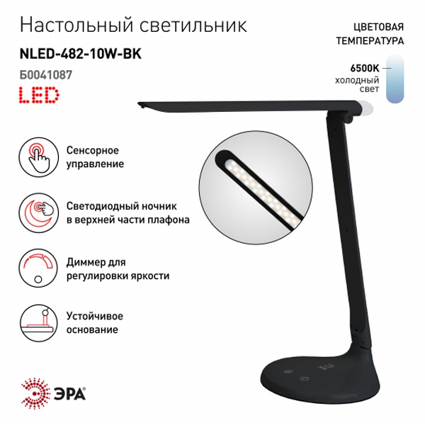 Настольный светильник ЭРА NLED-482-10W-BK - удобная складная модель с сенсорным управлением, с тремя уровнями яркости и светодиодным ночником в верхней части плафона. Светит холодным белым светом, который бодрит и повышает работоспособность. Ночник в верхней части плафона имеет отдельный сенсорный выключатель на основании.
