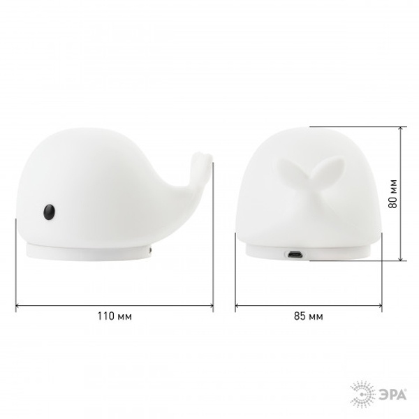 Светодиодный светильник-ночник ЭРА NLED-412-1W-P силиконовый, работа от 3 батареек типа ААА или USB, 2 режима: белый свет, RGB c переходами цветов, в виде кита Б0041088