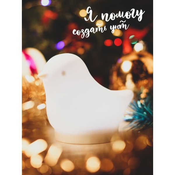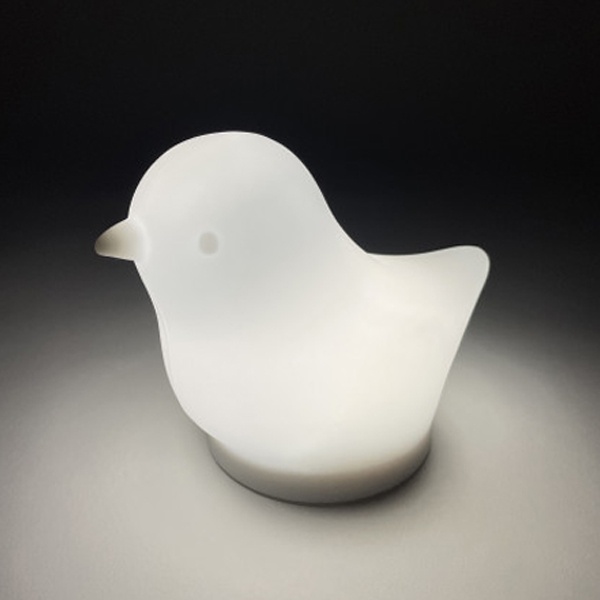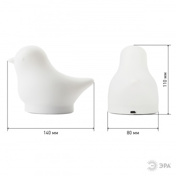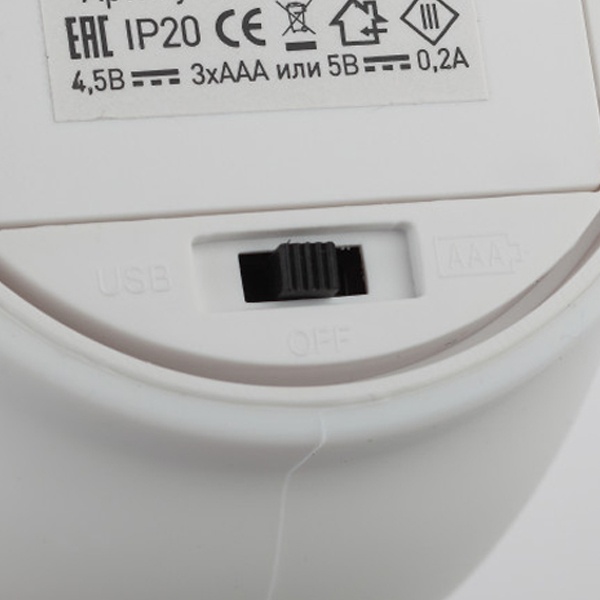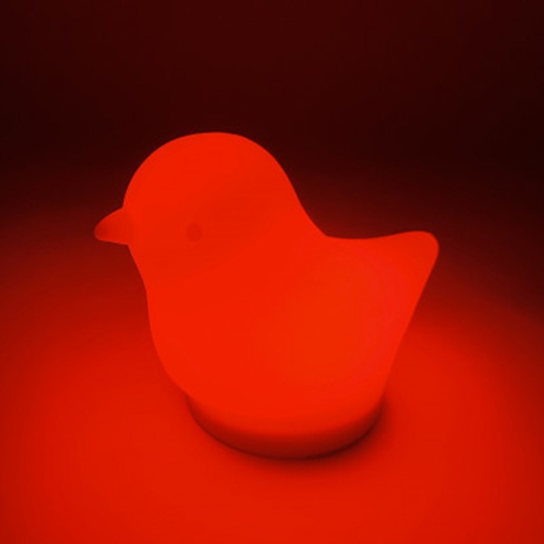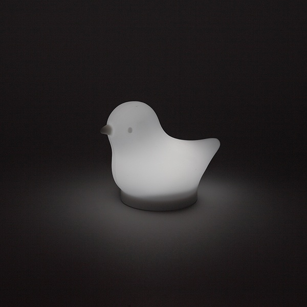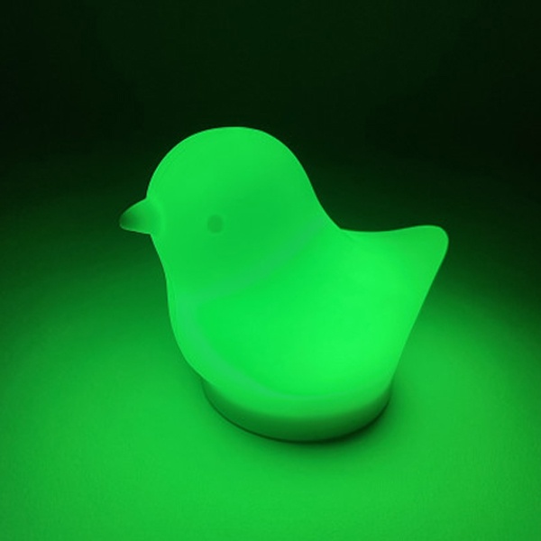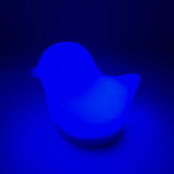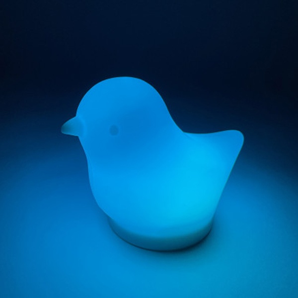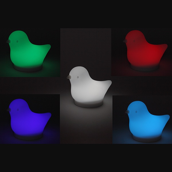 "Мягкий" материал. Работает от элементов 3 х ААА (не входят в комплект поставки) или от USB. USB кабель в комплекте. Выключатель для выбора типа питания и отключения/блокировки сенсора. 2 режима (переключение прикосновением): белый свет, RGB c переходами цветов. Дизайн в виде птички.