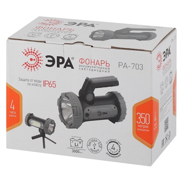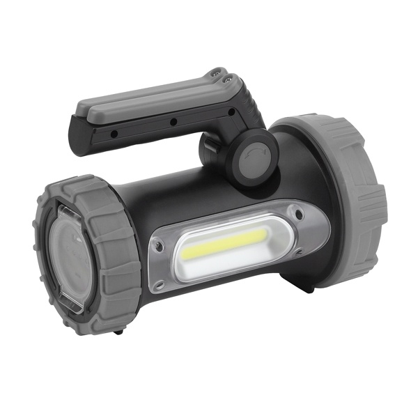 Мощный аккумуляторный фонарь-прожектор с боковым светильником и удобными складными ножками. Надёжно защищён от влаги и пыли (международный индекс IP65). Позволяет забыть о затратах на батарейки - заряжается от USB (провод в комплекте). Ёмкий литиевый аккумулятор (3000 мАч) хорошо держит заряд - одной подзарядки хватает на 4 часа непрерывной работы. Для контроля уровня заряда аккумулятора имеется световой индикатор. Фонарь отличается высокой дальностью освещения - 350 метров. Основной свет - это яркий светодиод 10 Вт, боковой светильник - яркая LED-плата с СОВ-диодами. Можно использовать с максимальной либо сниженной яркостью, а также включать аварийный режим мигания. Для выбора направления света ручка имеет регулируемую конструкцию. Основной светодиод формирует дальний направленный луч, светильник - ближний заливающий.