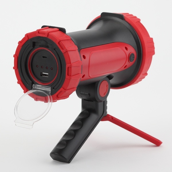 Яркий аккумуляторный фонарь-прожектор с боковым светильником, удобными складными ножками и функцией Powerbank. Современный гаджет для освещения и подзарядки мобильных устройств. Стильный чёрно-красный дизайн и особое удобство в использовании. Многофункциональная ручка регулируется для комфортного переноса устройства и выбора направления света. При использовании фонаря в режиме прожектора ручка превращается в одну из ножек подставки, обеспечивая прибору максимальную устойчивость. Корпус имеет высокий международный индекс защиты от влаги и пыли (IP65) - смело используйте фонарь в дождь, берите с собой на рыбалку. Литиевый аккумулятор отличается повышенной ёмкостью (6 мАч) - одной подзарядки хватает на 8 часов непрерывной работы (провод в комплекте). Мощный светодиод (10 Вт) обеспечивает высокую дальность света (350 метров), а боковая LED-плата создаёт заливающее ближнее освещение.