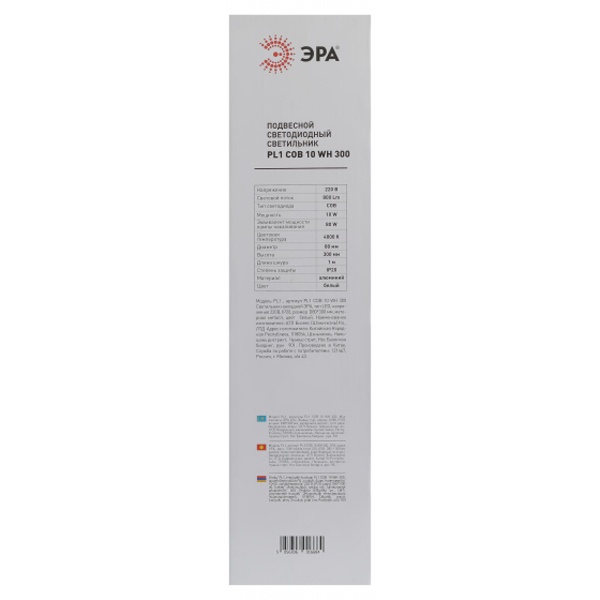 PL1 COB -10 WH 300 Подвес ЭРА Светильники подвесной светодиодный COB, 10W, D80*300мм, белый (20/240)
