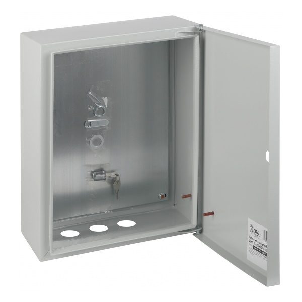 Дверца щитка закрытого типа оснащена замком с ключом. В комплект входит монтажная панель. Снизу имеется подвод кабелей в количестве 3-х единиц.