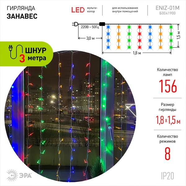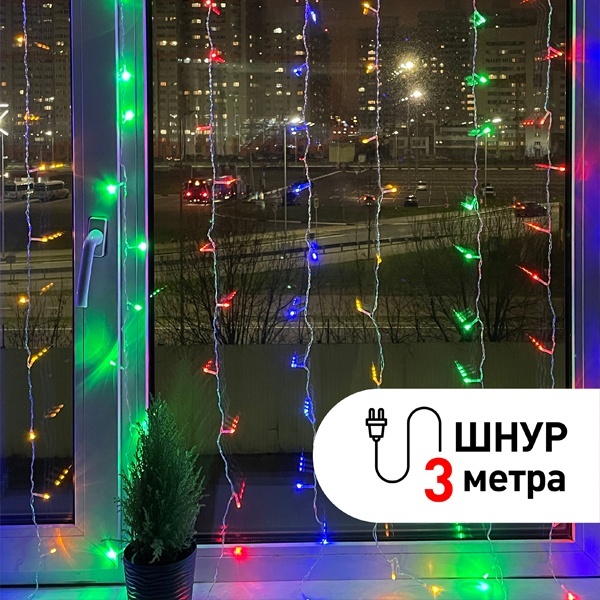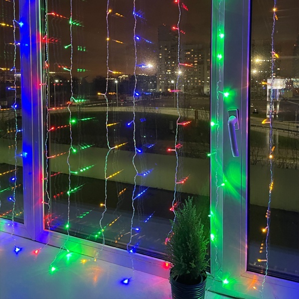 Новогодняя гирлянда формата "дождь" или "занавес" с разноцветными светодиодами и 8 режимами работы. На каждой нити расположены яркие LED-диоды конкретного цвета - зелёные, синие, красные, оранжевые. В совокупности это создаёт интересный волнообразный световой рисунок. Гирлянда имеет оптимальную для дома или офиса длину - 1,8 м. Длина каждой нити - 1,5 м. Данная гирлянда идеальна для украшения окон, стен, входных групп. Провода изготовлены из меди без примесей и из прочного поливинилхлорида, не поддерживающего горение. Сразу 156 светодиодов создают праздничную атмосферу и поднимают настроение.