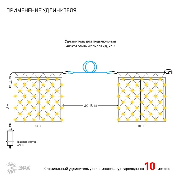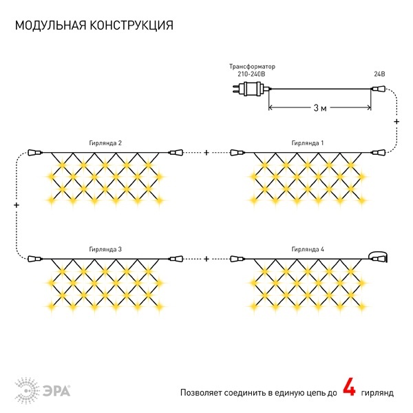 Праздничная светодиодная гирлянда ЭРА "Сеть" для использования внутри и снаружи помещений. Защищена от влаги и пыли (IP44), морозостойка - можно использовать на улице в регионах с низкими температурами. Идеальное решение для украшения окон, имеет оптимальные размеры: 1,2 х 1,5 м. На полупрозрачных малозаметных проводах размещены 144 ярких экономичных светодиода с уютным тёплым светом. Стильная аккуратная гирлянда ЭРА "Сеть" создаёт позитивное настроение и незабываемую атмосферу в доме, офисе, общественном пространстве. Применяется для новогодней иллюминации, оформления праздников, дизайна фотозон. Ещё одно преимущество - специальный разъём для сопряжения с другими гирляндами. Такая модульная конструкция позволяет соединять в единую цепь до 4 гирлянд ЭРА "Сеть", формируя длинный световой ряд для максимально эффектной иллюминации. Современная светодиодная технология экономит до 90% электроэнергии. Гирлянда отвечает требованиям пожарной безопасности, работает от трансформатора. Трансформатор ЭРА, преобразующий входное напряжение 210-240 В в выходное 24 В. Трансформатор в комплект не входит.