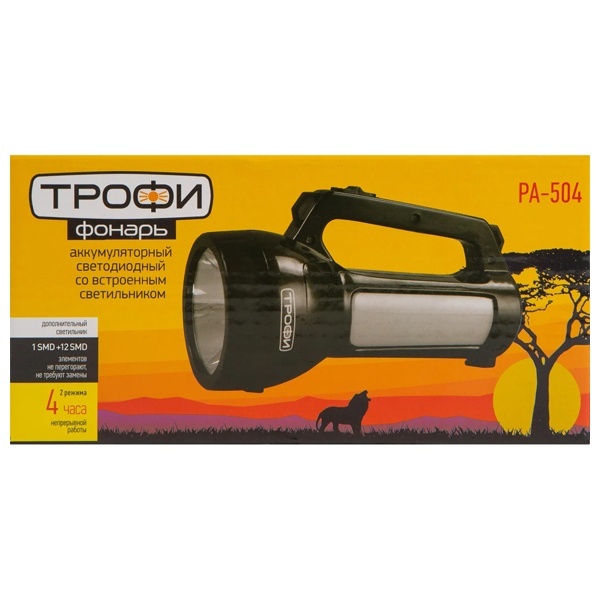 Трофи PA-504 – ручной аккумуляторный фонарь с боковым светильником. Во фронтальной части установлен мощный SMD-диод с дальним направленным светом, светильник состоит из 12 светодиодов с заливающим ближним светом. Для работы фонаря не требуются батарейки, одной подзарядки устройства хватает на 4 часа непрерывной работы. Эргономичная ручка, кнопка включения прямо под большим пальцем. С помощью этого простого в управлении фонаря можно эффективно освещать путь или организовать освещение на привале, поставив Трофи PA-504 на ровную поверхность в качестве настольного светильника.